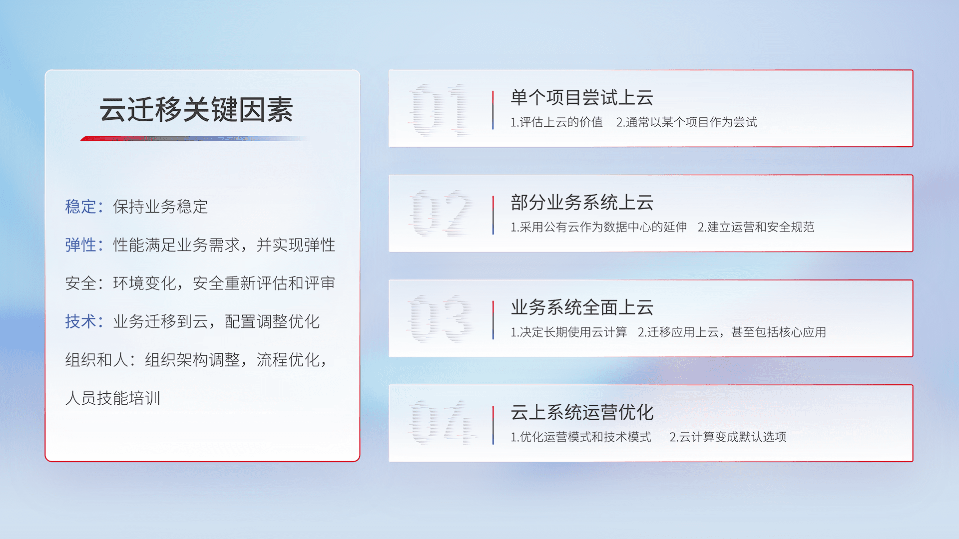 结合实际业务,,,从规划设计、、云平台选型、、、、云原生改造、、数据迁移、、、集成交付,,,迁移全过程为客户识别最佳上云路径,,,,做好风险识别管理,,,设计网络架构、、、、身份权限、、安全审计合规、、、操作审计、、日志审计、、、监控告警策略、、、、多站点容灾设计等,,对云上基础设施进行整体规划,,,,提升IT治理水平,,以满足弹性、、、、高可用、、、、高性能的需求。。。。