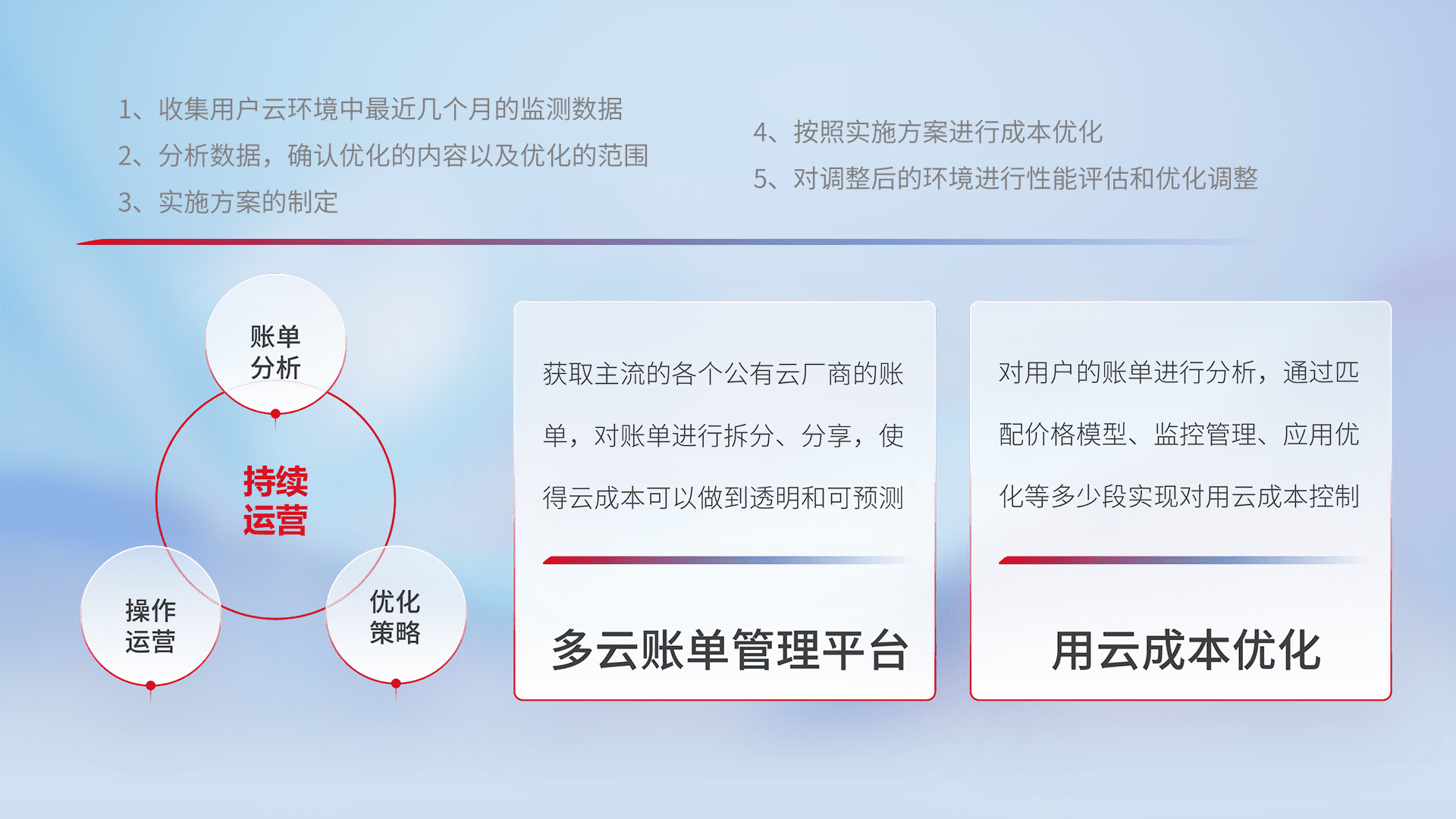 通过多云纳管,,,以统一的资源数据模型把客户的云资源进行抽象和封装,,,,进而实现对多云资源的统一操作,,,保障云资源管理的可靠性、、稳定性与可用性。。。量身定制化运维内容,,配置、、开发运维、、、补丁管理、、备份、、监控、、认证和访问管理、、审计和日常巡检等,,,保障在用云过程中的可靠度,,,,稳定度以及高可用率。。。